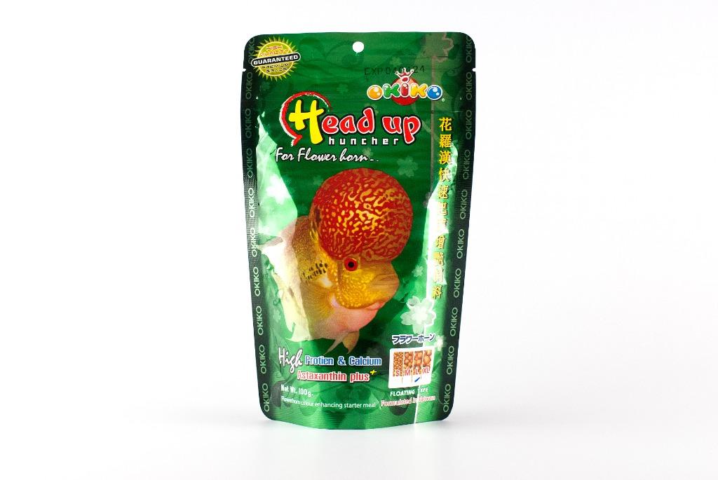 Okiko Head Up Huncher Flowerhorn Fish Food 100g (Medium, Floating Type) is a premium-quality specialized diet designed to enhance head growth (Kok development), improve body shape, and boost overall coloration in Flowerhorn cichlids. This advanced floating formula delivers balanced nutrition for strong growth and vibrant fish appearance.